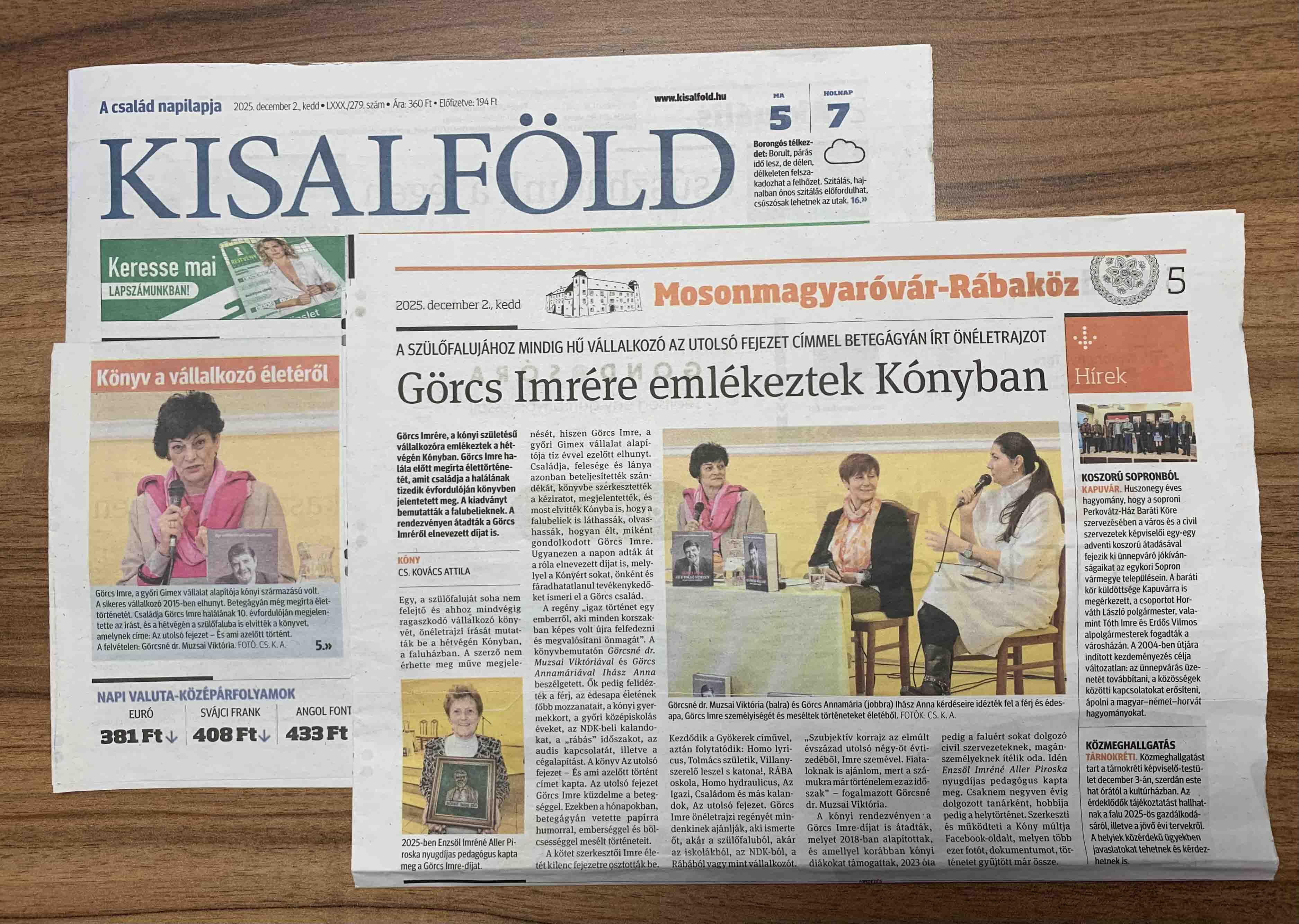 November végén különleges eseménynek adott otthont Kóny: bemutatták a település szülöttének, Görcs Imrének – a GIMEX alapítójának–, posztumusz kiadásban megjelent önéletrajzi kötetét Az utolsó fejezet – és ami azelőtt történt címmel. A könyvbemutatóval egyidőben a Gimex ügyvezető-tulajdonosai átadták a 2025-ös Görcs Imre-díjat is.
